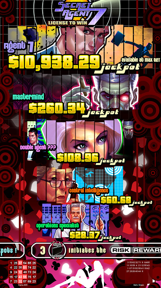 Inspired by the classic spy film genre, Secret Agent 7: License to Win is a spy themed video slot game. In setting the visual tone of the game, we referenced the styles of the UK’s Swinging Sixties so as to keep the game fun in feel, and balance out the color scheme with dynamic patterns, and lava lamp colors that allow the visuals to pop further.